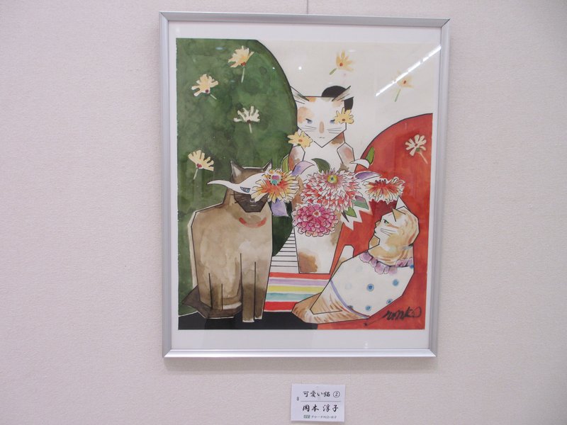 会員は三十代から百歳を超える方まで年齢層が厚く、なかには初心者から展覧会に入選する会員もおられ、力量は様々だそうです。3枚目の写真「可愛い猫」は八十五歳の女性の作品で、鑑賞していると楽しくなる素晴らしい水彩画でした。