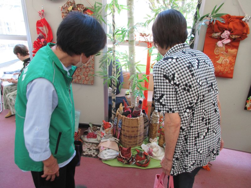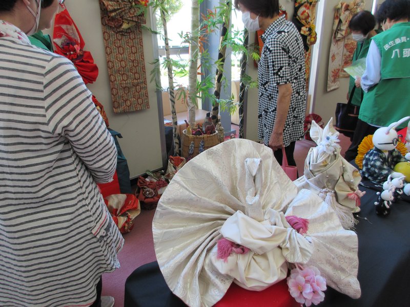 また、ホワイエではグループさくら(代表山根政恵さん)による帯アート展が開催され、鶴や亀、兎、兜、蝶やタペストリーなどを展示しました。シニアバンクに登録いただいています。ご覧になった方々からは「すばらしい、制作時間はどのくらいだろうな」「帯が生き返っている、こんなことができるなんてすごいなあ」など、ハサミをいっさい入れず一反の帯でつくられた作品に感嘆の声が聞こえました。代表の山根さんは「帯アートは帯の特長を生かしながら想い出の帯を生まれ変わらせるのが楽しみです。多くの皆さんに帯アートの素晴らしさをご覧いただきありがとうございました」とおっしゃっていました。
