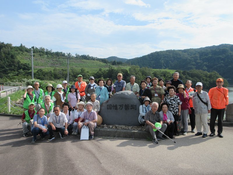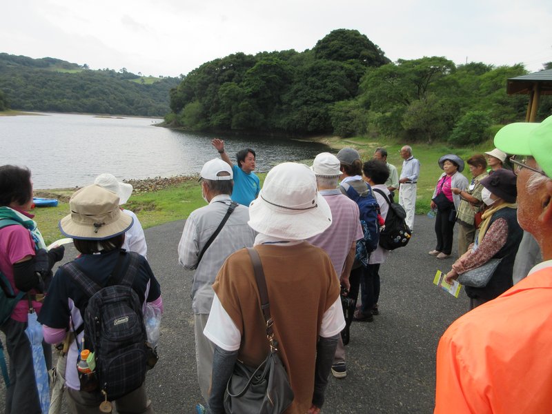 一行はバスで多鯰ヶ池に向かい、浜湯山・多鯰ヶ池活性化委員会大塚尚生委員長からお種伝説や多鯰ヶ池の活性化に向けた取り組みについて説明を伺いました。池を見るだけではなく楽しめることを目的に、手づくりいかだレースやSUP、子どもたちのファッションショーなど地域の人も楽しめる取り組みを進めています。