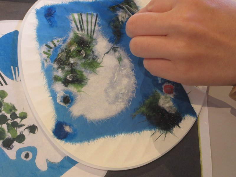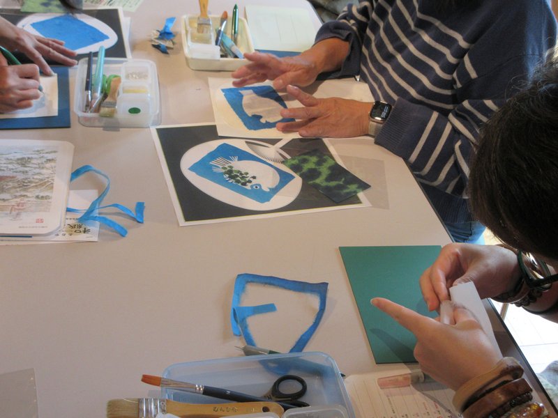 森さんはじっと見ていて時々アドバイスされますが、個々の個性を大切にしていることが分かります。「ちぎり絵で和紙の特長が分かりました。参加してよかったです」「水筆があると作りやすいことが大きな発見です」「和紙のフワフワとした表情が最高です」「作っているとどんどんアイデアが出てきて引き込まれていきますね」と初めてのちぎり絵体験を楽しんでいました。