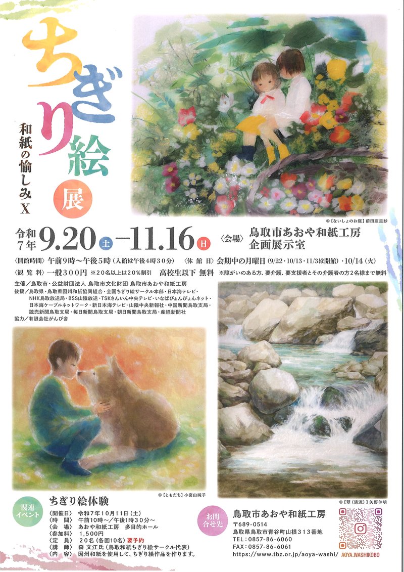 あおや和紙工房では11月16日までちぎり絵展が開催されています。全国から集まった作品の数々は和紙の特長を生かした大作ぞろいです。ぜひご覧ください。