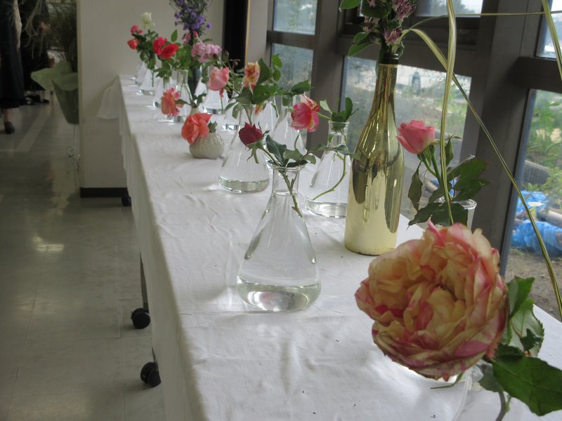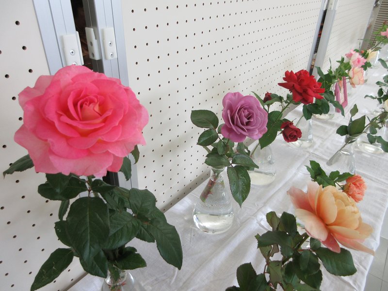 この夏はたいへんな猛暑で、バラの育成には様々な苦労があったそうです。「日中に水やりをすると熱くなった水でバラを痛めるし、木自体が弱くなる」「秋の花付きにも影響があるが、会員さんの根性でこれだけの花を出展することができた」とおっしゃっていました。