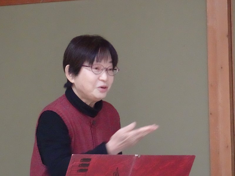 最初に『どんぐりころころ』を歌いながら指を動かして脳を活性化させます。リラックスしてきたら、幼い頃に口ずさんだ『もみじ』の二部合唱です。スタートは副旋律が主旋律を追いかけていたのに、ラストは美しく重なりました。続けて参加者にとって懐かしい曲『旅愁』の歌唱です。「教科書に載っていた」「運動会のダンスで踊った」など、昔の経験や思い出で盛り上がりました。体操は座位で、『上を向いて歩こう』『ああ人生に涙あり』を歌いながら、無理せずゆったりと体を動かします。最後に『愛燦燦』を歌いました。