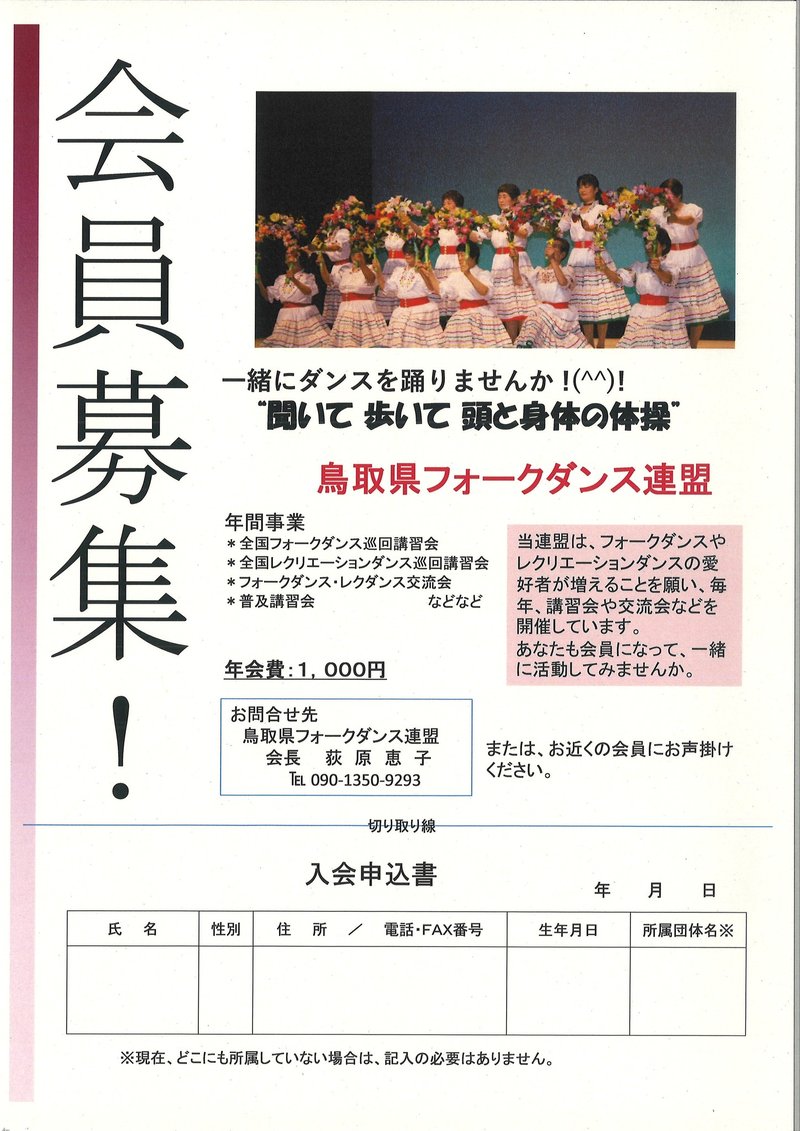 フォークダンスに興味のある方は荻原会長にご連絡ください。電話090-1350-9293、詳しくはチラシをご覧ください。