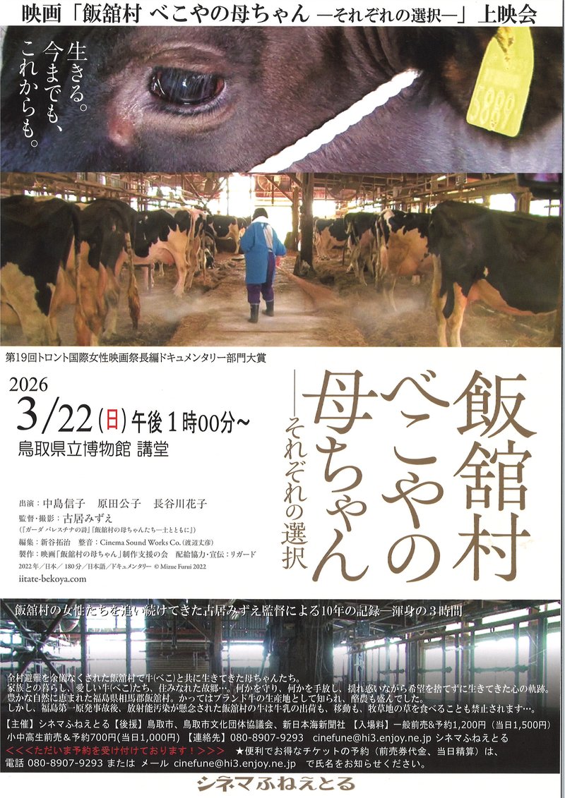 次回上映作は「飯館村べこやの母ちゃん」、全村避難を余儀なくされた飯館村で牛(べこ)と共に生きてきた母ちゃんたちのドキュメンタリー作品、3時間の長編映画です。第19回トロント国際女性映画祭長編ドキュメンタリー部門大賞受賞作です。