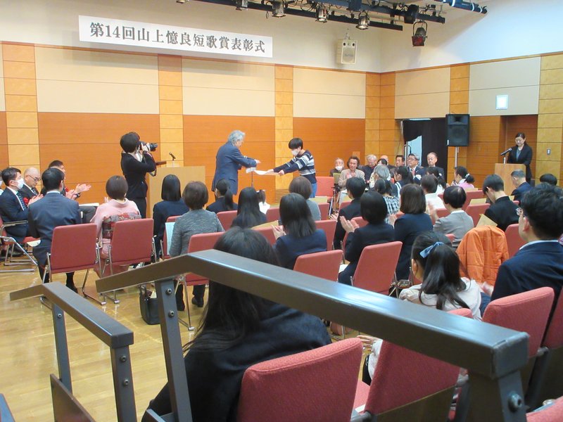 万葉歌人山上憶良を顕彰するため倉吉市教育委員会は鳥取県歌人会(代表押本昌幸さん)、山上憶良の会(代表福井伸一郎さん)とともに、山上憶良伯耆守赴任1300年を記念して2011年から「山上憶良短歌賞」を続けています。今回で第14回となり、応募作品数は4450首、うち県内応募1853首、県外応募2595首、国外2首です。家族をテーマにした同短歌賞は国内短歌賞として定着し、多くの皆さまに愛されています。