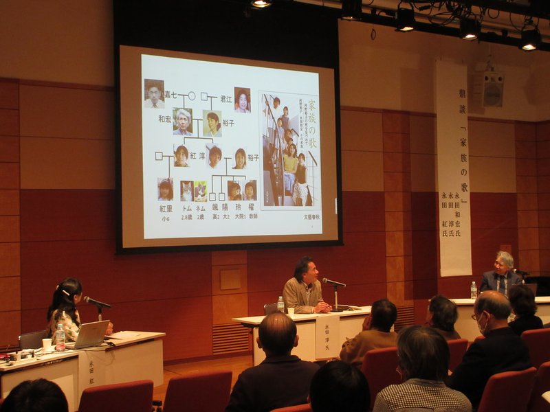 午後は筆頭選者永田和宏氏と淳氏、紅氏ご家族による鼎談「家族の歌」です。和宏氏は京都大学名誉教授、短歌結社「塔」前主宰、宮中歌会始詠進歌選者、淳氏は出版社「青磁社」代表、「塔」選者、紅氏は「塔」編集委員、NHK短歌選者。和宏氏の妻は故河野裕子さんと、みなさんが短歌界では著名な方々です。