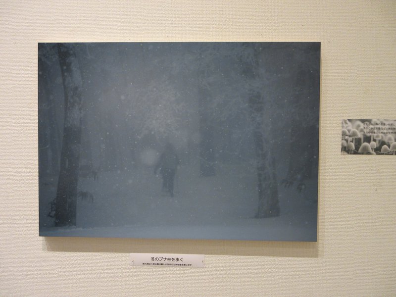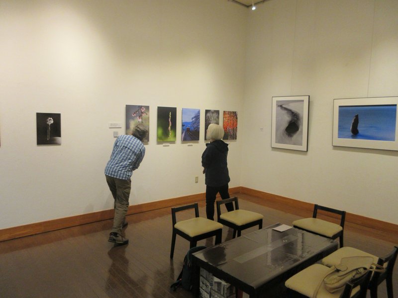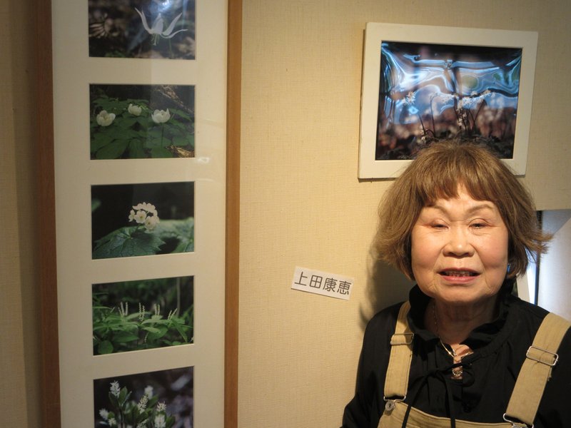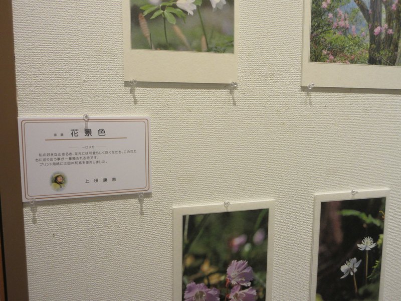 時本さんは「森の精霊」3作、このうち大山大野池の作品は30秒間シャッターを開けて撮影し、水面は霧の罹ったようになり、朽ちた木が浮かび上がった幻想的な一枚です。上田康恵さんは「花景色」として、因習和紙にプリントした作品群を展示しています。「一度和紙にプリントしてみたかった。鮮明さ明瞭さはありませんが、『もやッとした』雰囲気が小さな花たちを際立たせている」とおっしゃっていました。